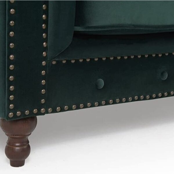 This chesterfield-style sofa is the ideal addition to any living room. Featuring a classic design with traditional elements such as deep button tufting, scrolled arms, and nailhead accents, this sofa is a statement piece that can change the whole flow of your living room. This sofa also has deep seating and exceedingly comfortable cushions specifically designed with your comfort in mind. This sofa is sure to impress both you and your family. Designed with the traditional chesterfield sofa in mind, this sofa hits all the key elements, with deep button tufting, nailhead accents, scrolled arms, and turned legs. Featuring deep button tufting for both design and comfort. The tufting allows for breathing space while you relax, limiting the amount of heat that is generated. To complete the chesterfield look, this sofa features scrolled arms. Not only does it add an air of class to the sofa and your room, but it also provides a more comfortable place to lean against while relaxing on your sofa.. Description: – With frame and leg made of solid wood, strong load capacity up to 150 kg, robust and durable.br />-Velvet fabric cover with velvety soft feel, deep button tufting, rolled arms and tassels for luxurious vintage style.br />- Soft padding for added comfort. – Ideal for living room, family room, bedroom, etc. – No assembly required, the product is delivered in a preassembled state.br />